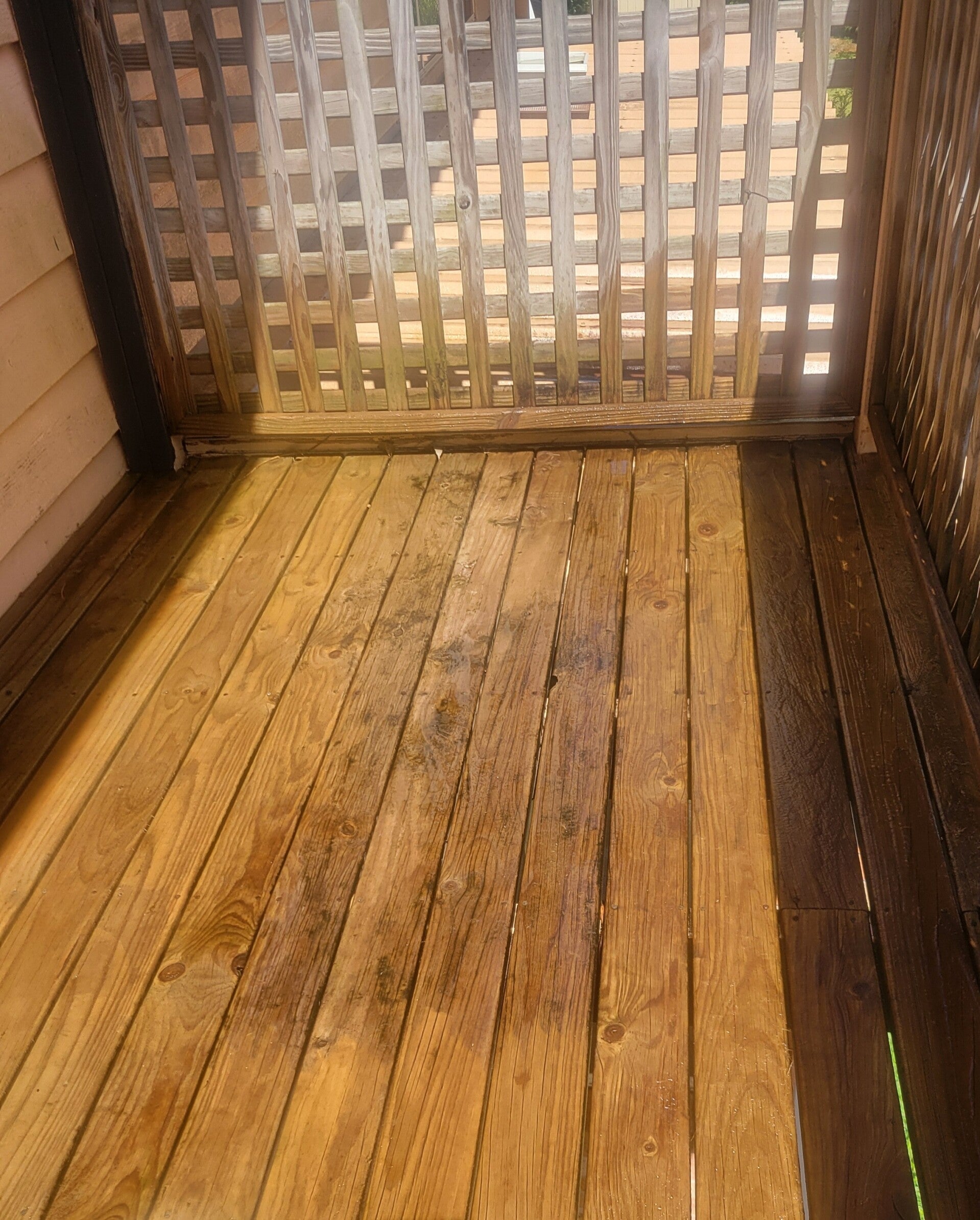 Notice the new plank in the centre - you can barely see its been replaced once it had 3 coats on it and the rest of the deck was cleaned